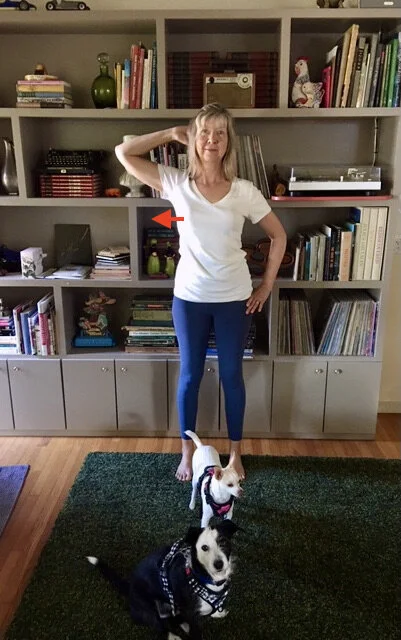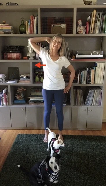 2. With parallel feet, and your hand behind your head (or on your chest) take a nice inhale into the area with the red arrow (mid thoracic). Visualize space and take a few breaths. Both sides.